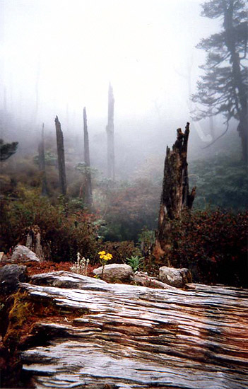 | Durante um trecking nos Himalaias. Ao passar por uma floresta queimada, onde as grandes árvores tinham morrido quase todas. Esta pequena flor, acabada de nascer, estava firme contra o vento. Uma gota de cor no mundo cinzento queimado. |