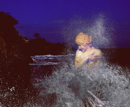 Uma estátua desconhecida, que parece uma senhora suepreendida, no meio das ondas do mar Mediterrâneo, perto do Mónaco.