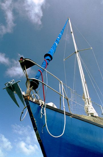Barco azul com céu azul, em direcção a águas azuis?