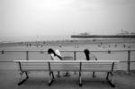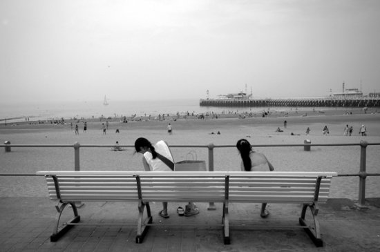 This image is part of a series taken in Oostende, at the coast in Belgium.The railing along the promenade runs along the promenade where visitors gather for walks all year around. The Railing is always the same: only the people and the scenes change , and if one is patient one can witness the world passing by in the variety of situations and poses. Here two asian girls, bend simultaneously to the let and remind one of supple reeds blowin by the winds of the North Sea.