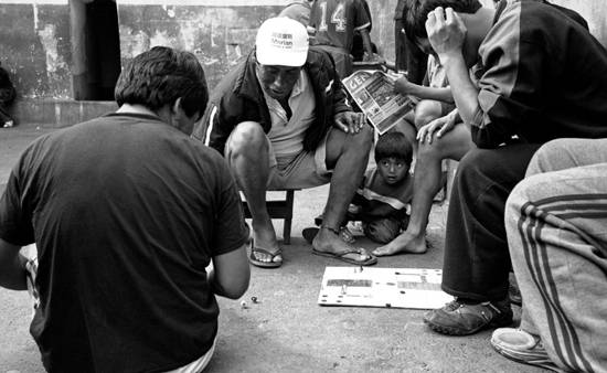 Mutikoaren begiradapean presoak partxis jokoan.