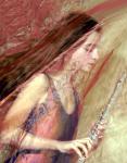 This image entitled Syrinx1, Is a portrait from a series of color images revolving around the famous flute solo by Claude Debussy with the same name. In this legend ,the shepard god, Pan, falls in love with the maiden of the river, Syrinx When she rejects his love, he follows her and she flees. In his sorrow, he turns her into reeds by the banks of the river and cuts them down in order to make a flute, upon which he plays his sad songs. Being a professional flutist and flute teacher, I was interested in capturing the atmosphere of the legend and the music of Debussy which I have performed many times. I used a student as model and treied to bring out her innocence. Through the use of color backrounds and transparent materials I attempted to create a mythical atmosphere, by using the warm colors of the earth. The forward movement suggests the fleeing movement of Syrinx. The flute is the connecting element for the legend which inspired Debussy to compose the music