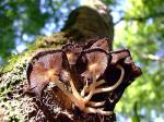 pequenos cogumelos crescendo em direção ao sol. Seu habitat natural é o húmus dos bosques, como parasitas nas árvores.
